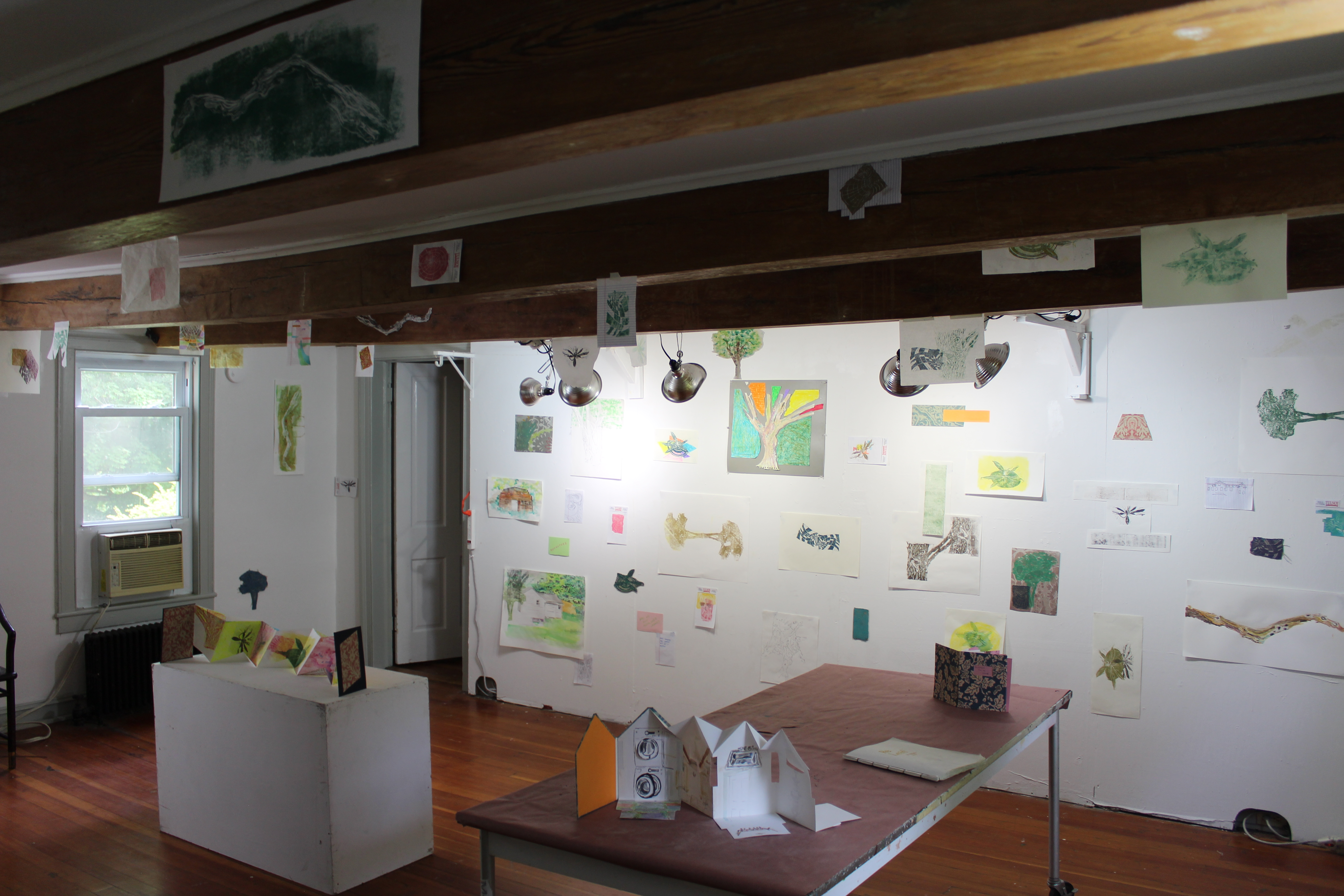 Within a monthlong residency at ChaNorth, in Pine Plains, NY, I created an installation of works on paper and artists books. Using observational drawing as the germinating seed, I translated the local flora onto linoluem blocks and loose paper. These became objects I could experiment with, using the printing process to create different variants on the same image. In using the ceiling rafters to mount other drawings and prints, I evoked the forest canopy, while the use of text and color questions our relationship to nature in the present, especially in regards to consupmption.