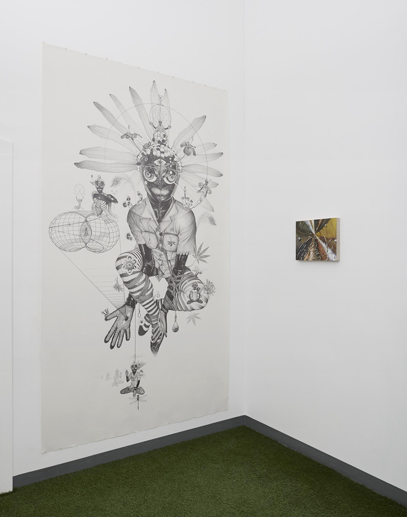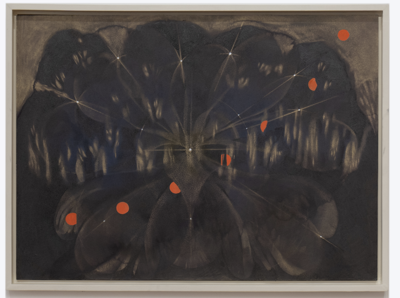 In Charmoli Ciarmoli, a space tucked away in a midtown office building, Carla Perez has projected a strange and beautiful vision through drawings, paintings, and hand blown glass. There’s a youthful exuberance in embracing all of these forms, especially for the artist’s debut solo show. Still, it’s obvious that they come from the same mind and hand. Curator Nakai Falcón’s arrangement affords each medium its space, while allowing the forms to speak to one another to form an overarching narrative. Throughout Devourer of Sunsets, Perez elevates nature as an aid in mediating her cross-cultural experience as a Dominican New Yorker. Her paintings recall the Mannerists and Fauves in their bold palette and heavy paint. The flowers within these brooding yet inviting scenes float out of the frames to hang from the ceiling in glass. They mimic the elongated figures in a similar palette within Perez’s funny, grotesque graphite drawings, reminiscent of Goya’s etchings. The mysteries whispered between the translucence and radiant color have followed me out of the gallery and found foothold in my mind.