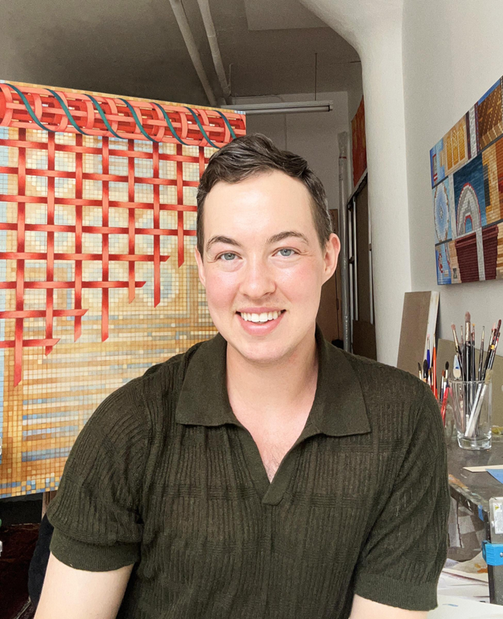On the row of columns in the McGolrick Park pavilion, curators Christine Stiver and Dominic Terlizzi ratchet-strapped the experiments of 13 artists working on large drop-cloths. Strong colors burst across the diverse work which spanned painting, dying, drawing, stitching and collage. The show’s title (type-o intentional) gave artists permission to work outside their familiar media–like usual color pencilist Sarah Grass, who made a site specific painting of the park’s memorial statue, complete with shiny jewels and a brass halo. Others held a dialogue with the pavilion itself, like Mahsa Fard’s embroidered gothic archway, hung at the structure’s far wall, a recess or portal into an imaginary space. Pol Morton addressed the threat of pigeon poop by including cut-outs of the birds on their work’s outward facing surface, and pictures of their cats on the inside surface. Light speckled through these makeshift canvases, and the wind billowed them in a breathlike motion. Dogs barking and children playing tag at a birthday party made a background just beyond. Seeing this overarching experiment in a wholly public setting made an inclusive, chance-prone experience, which has felt central to this special summer.